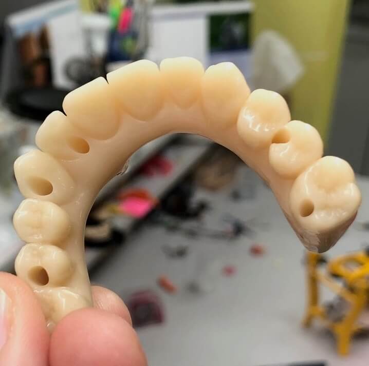 Zuby frézované z kompozitu nebo jiného materiálu jsou osazeny do konstrukce a fixovány pomocí speciálních adhezivních kompozitních lepidel.