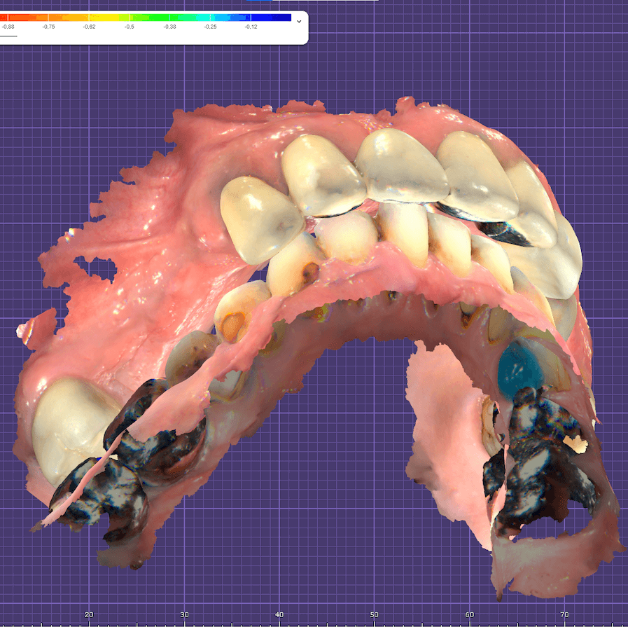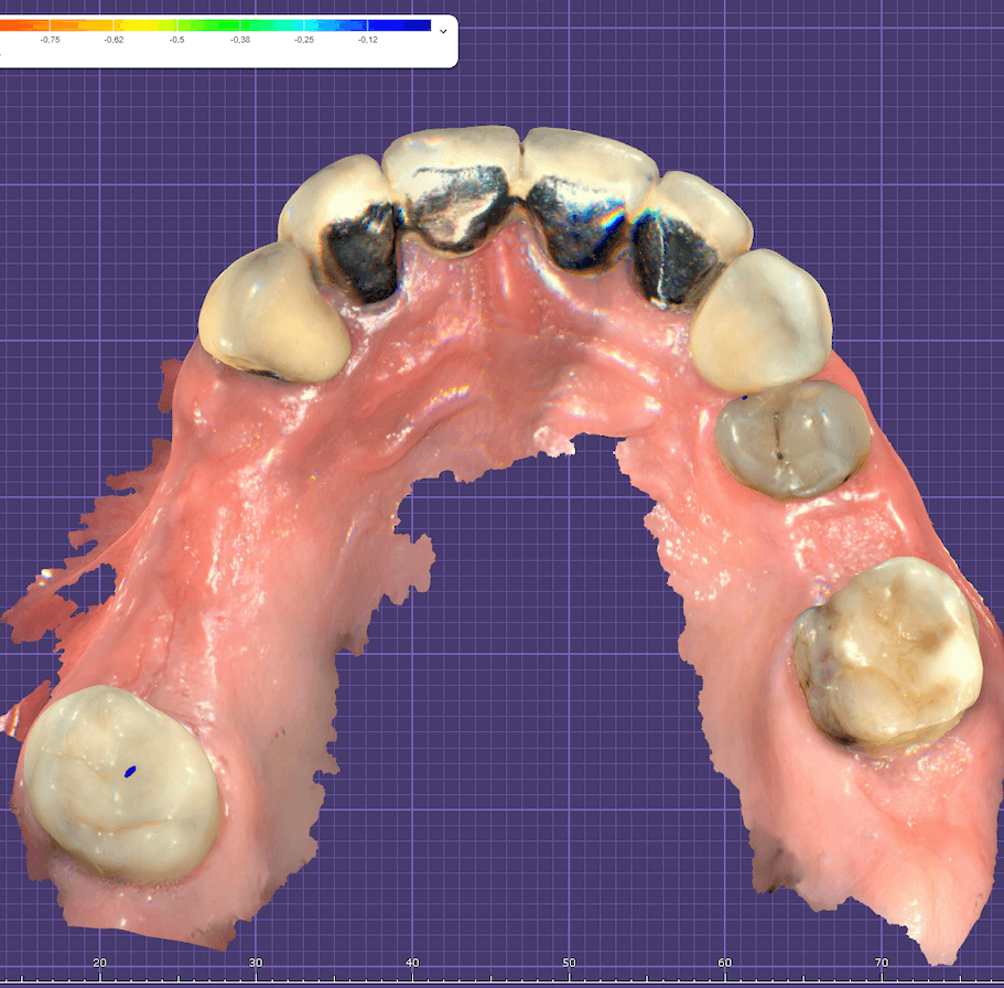 Naskenujte celou čelist, ve které chybí zuby. Je nutné detailně zachytit všechny zbývající zuby, okolní gingivu a sliznici. Sken musí jasně zobrazovat všechny oblasti, kde bude umístěna zubní náhrada.