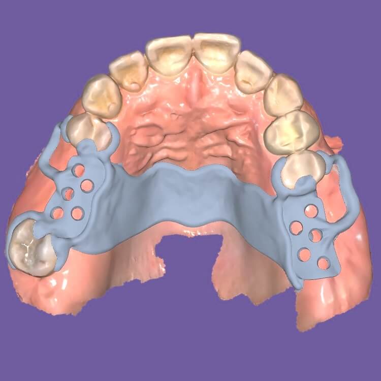 Na základě intraorálního nebo klasického skenu CAD technik vytvoří virtuální model čelisti a navrhne základnu náhrady včetně sedel, opěr a retenčních prvků. Návrh zohledňuje přesný dosed na sliznici i zachycení všech anatomických detailů.