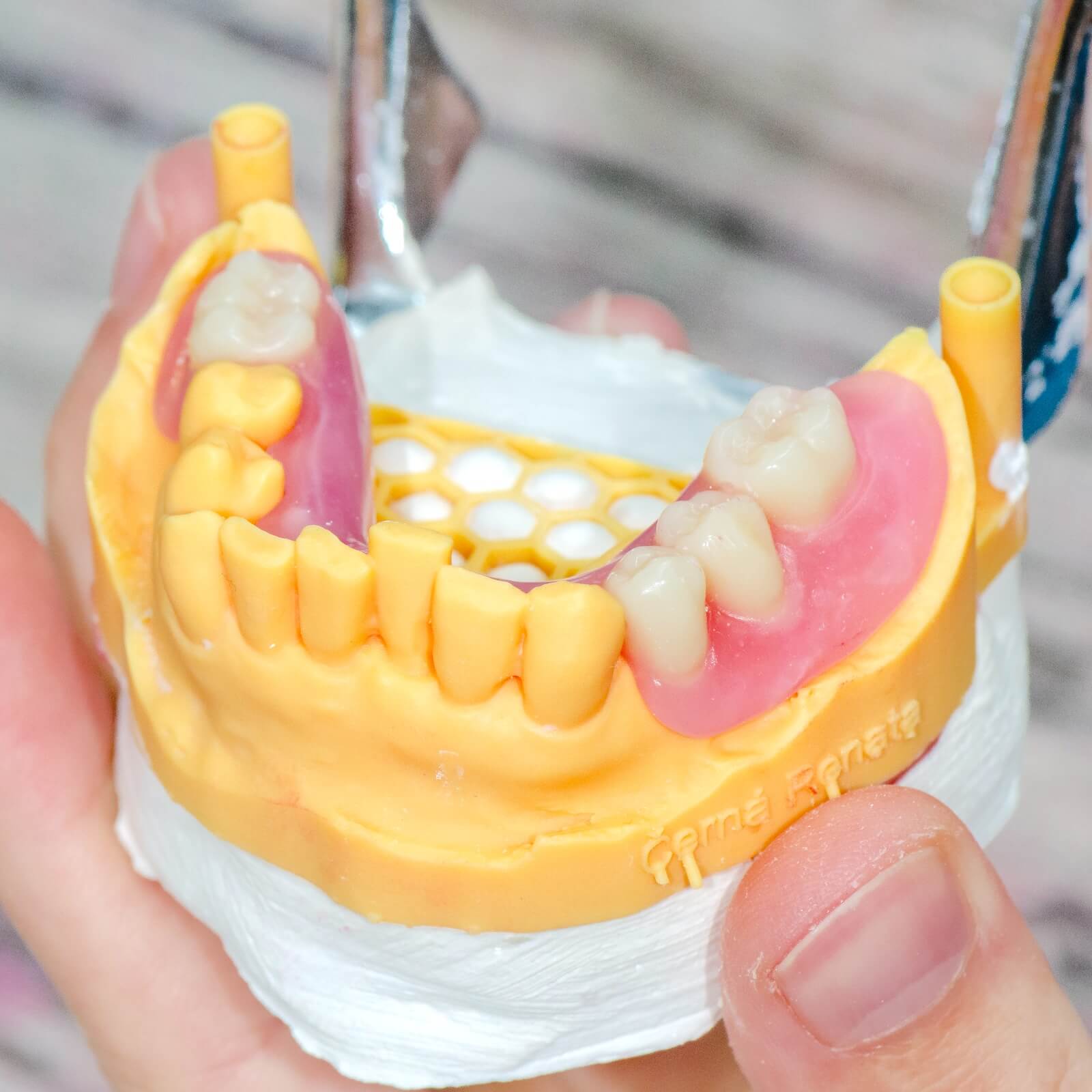 Po přijetí přesného otisku technik vylije sádrový model a zkontroluje přesnost ve všech klíčových oblastech – zejména v okolí zbývajících zubů, přechodových valů a sliznice. Na kvalitě modelu závisí přesnost budoucí náhrady.