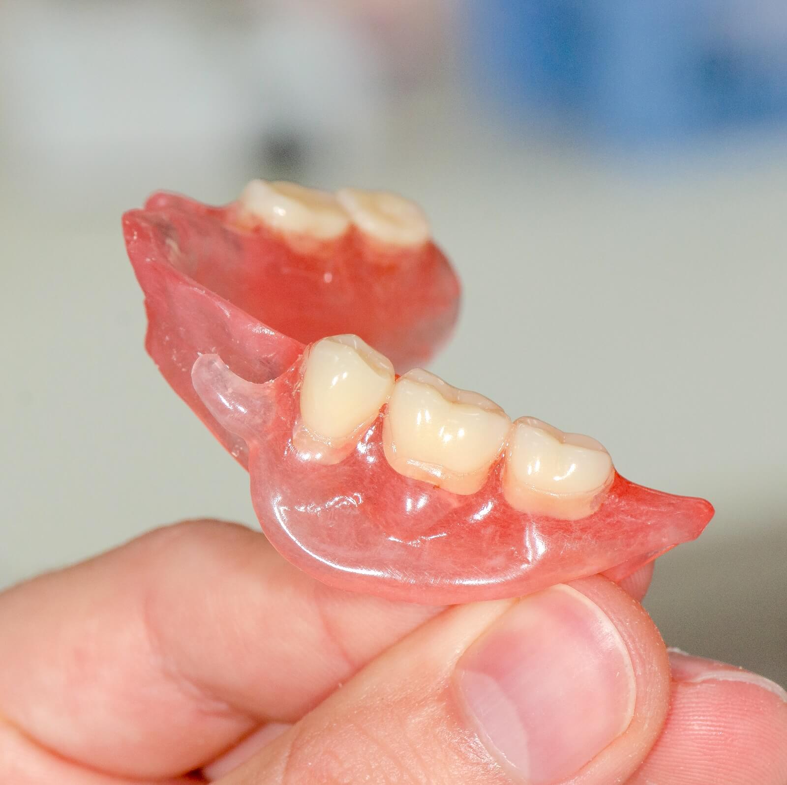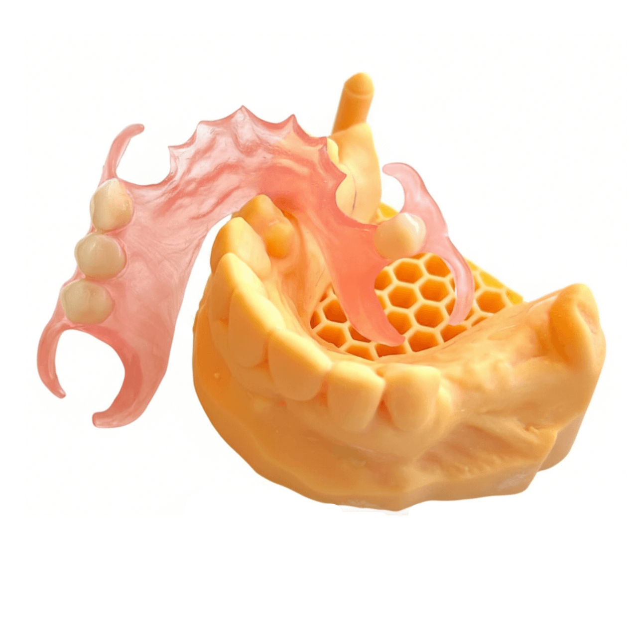Voskový model se zasádruje do speciální kyvety. Pomocí vysokotlakého přístroje se granulát zahřeje a vstřikuje do formy. Tím vznikne přesná zubní náhrada, včetně pružných retenčních prvků, které jsou součástí protézy.