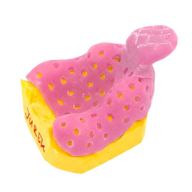Náhrada se kompletně domodeluje ve vosku a pečlivě zkontroluje. Poté je odeslána do ordinace ke zkoušce – lékař ověří estetiku, funkci a skus. Teprve po schválení přecházíme k finálnímu vstřikování pružného materiálu.