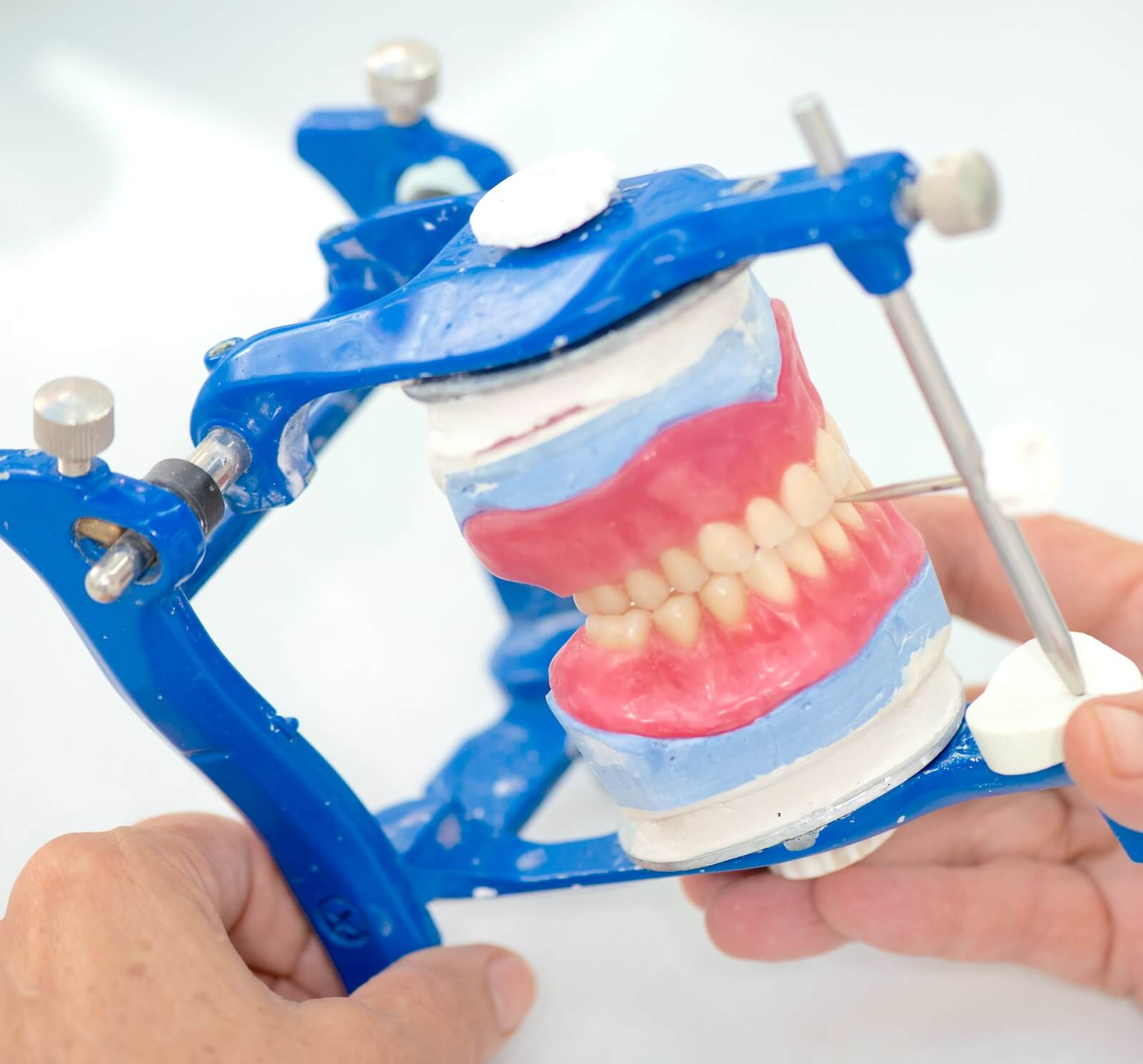 Na základě registrace skusu od lékaře technik upevní horní a dolní model do artikulátoru. Pečlivě nastaví výšku skusu, středovou linii a orientační rovinu dle značení od lékaře.