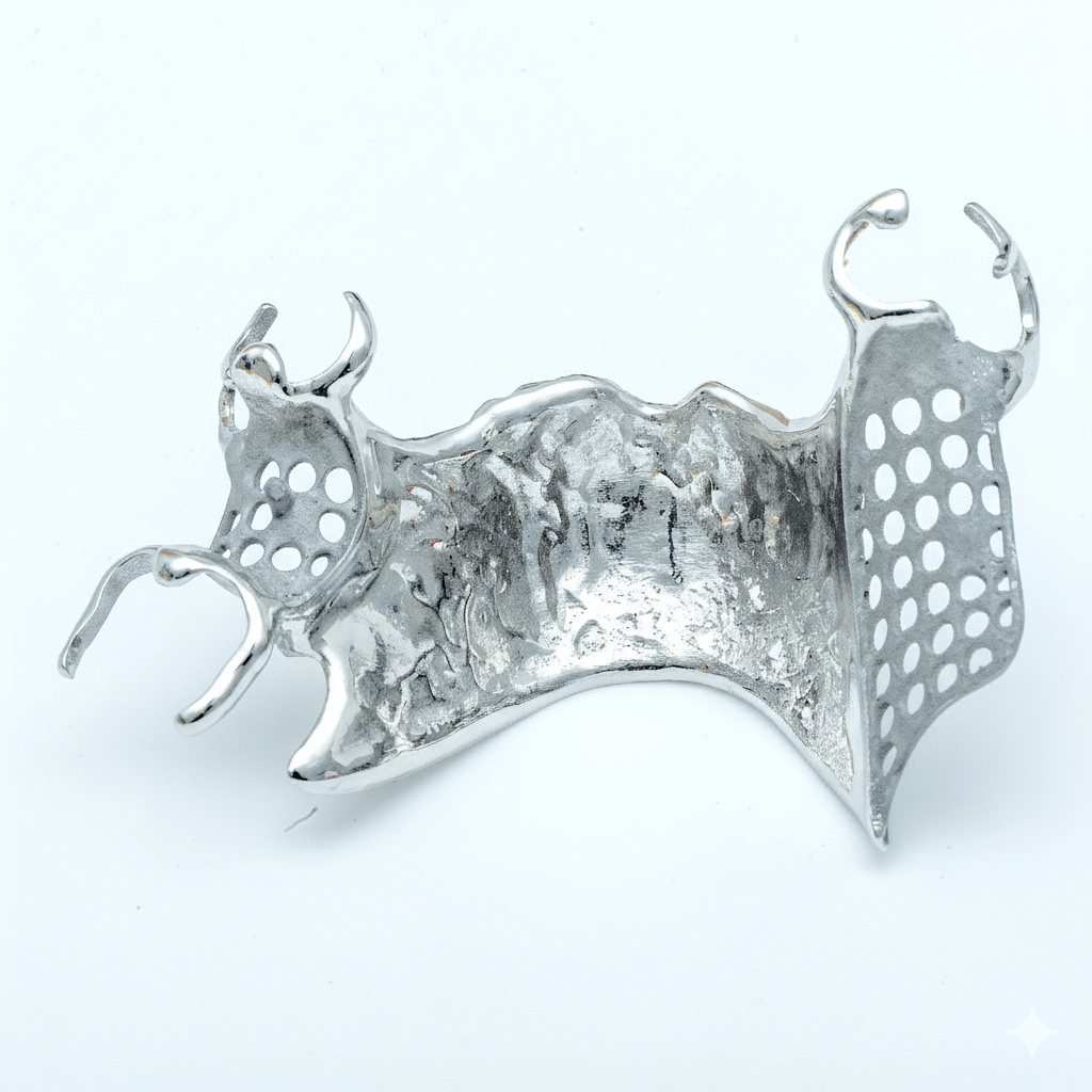 Konstrukce z CoCr nebo titanu se vyrábí v externím frézovacím centru pomocí technologie laserového sintrování. Tento postup zaručuje vysokou přesnost a pevnost díky vrstvenému tavení kovového prášku řízeným laserem.