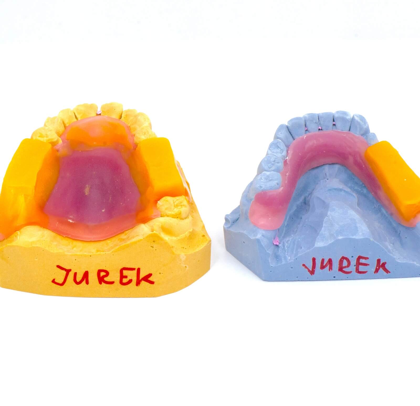 V případech, kdy skusová situace není jasná nebo chybí opěrné zóny, zhotovujeme klasické skusové šablony. Ty se následně odesílají do ordinace k určení přesné výšky skusu a vztahu čelistí.