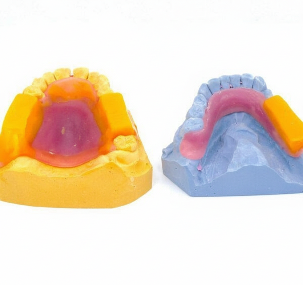 V případech, kdy skusová situace není jasná nebo chybí opěrné zóny, zhotovujeme klasické skusové šablony. Ty se následně odesílají do ordinace k určení přesné výšky skusu a vztahu čelistí.